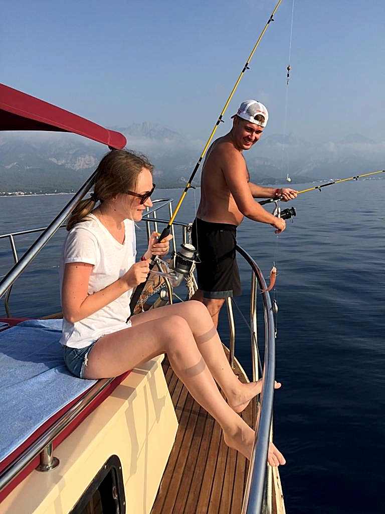During the Fishing trip along the beautiful bays of Antalya ,you may experince and enjoy a tailor made day of Fishing,sightseeing,lazy day,sunbathing,swimming,snoozing and eating and drinking….