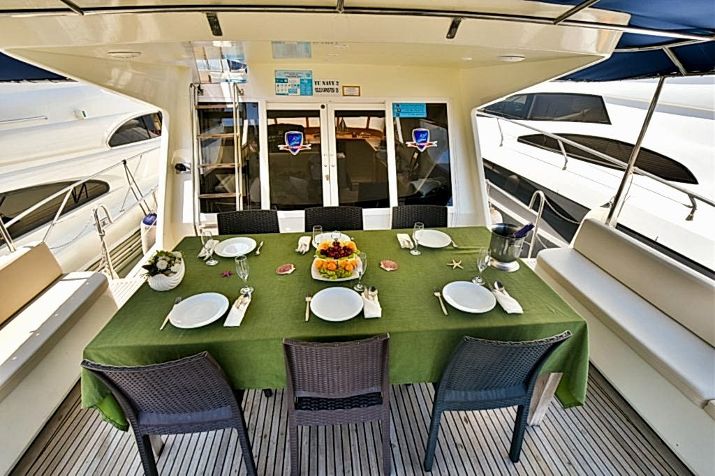 The outdoor space features an exceptionally beautiful design with lounges and areas where you can enjoy the warmth of the sun. The English-speaking and friendly crew will make every possible effort to pumper and accommodate your needs. The professional crew will also prepare and serve you lunch or dinner, depending on the time of your tour, consisting of mouth-watering flavours.