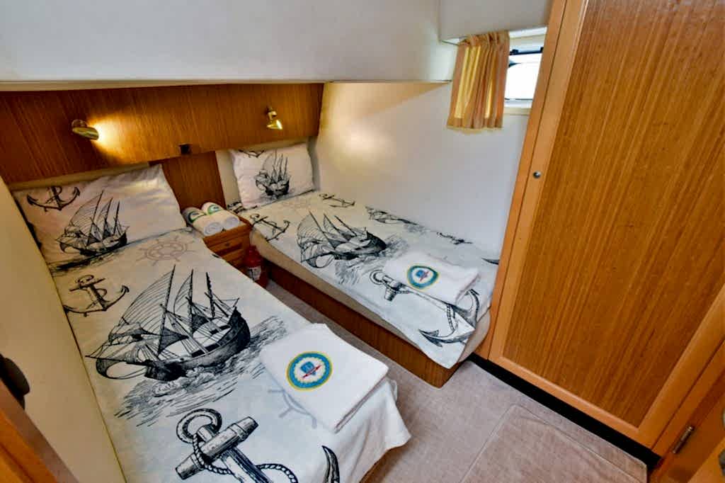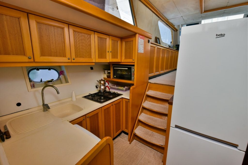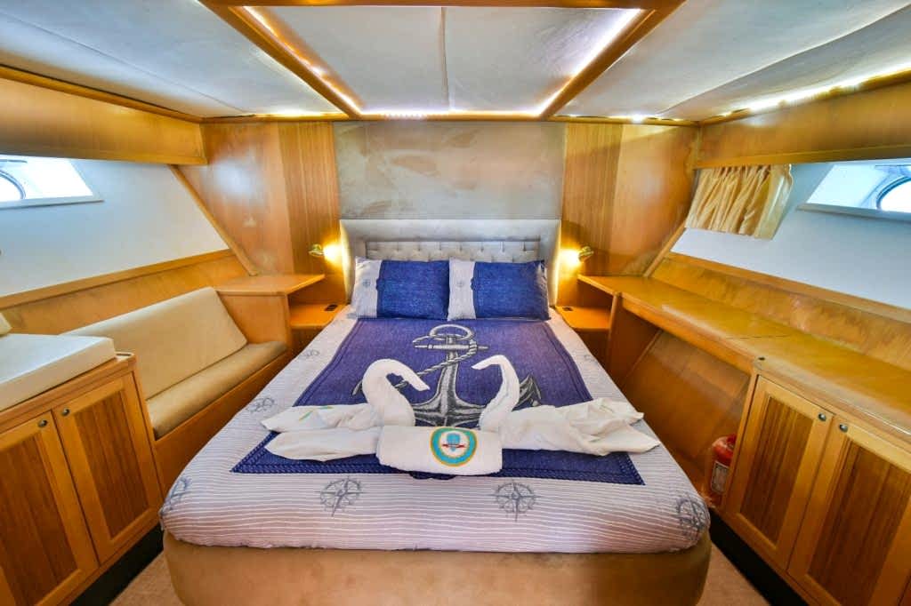 The boat has everything you might need for a pleasurable and joyful experience. Elegantly designed and decorated, the yacht features comfortable and spacious indoor and outdoor areas. More precisely, inside there are cabins, toilets with showers, an indoor lounge with comfy and sophisticated furniture, and a fully equipped kitchen.